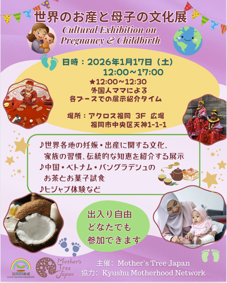 世界各地の妊娠・出産に関する文化、家族の習慣、伝統的な知恵を紹介する展示を行います。また、中国・ベトナム・バングラデシュのお茶とお菓子試食、ヒジャブ体験もできます。出入り自由で、どなたでも参加できます。ぜひ足をお運びください!