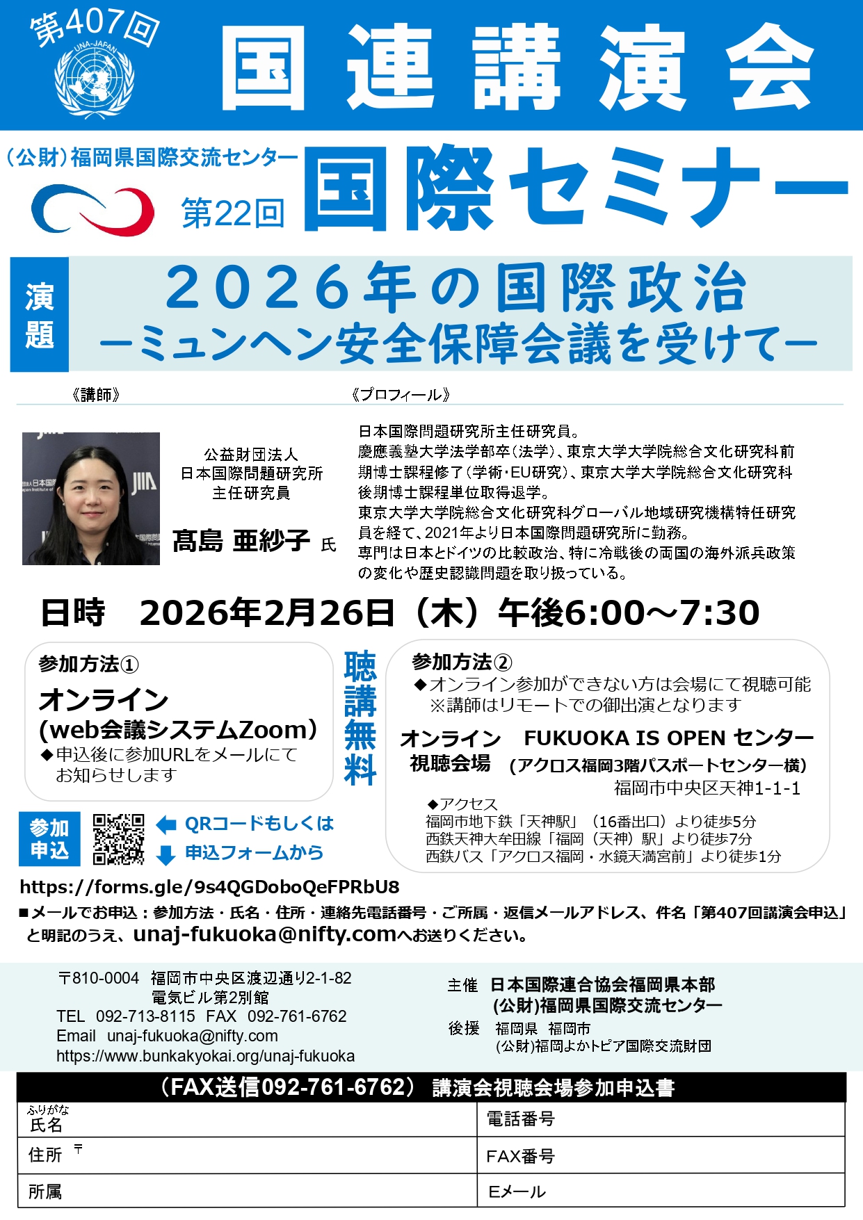 (公財)福岡県国際交流センターでは、県民の国際問題に関する理解を促進するため、毎年、(公財)日本国際問題研究所と共催により、様々なテーマによるセミナーを開催しております。(今回は、日本国際連合協会福岡県本部の国連講演会と共同開催いたします。)