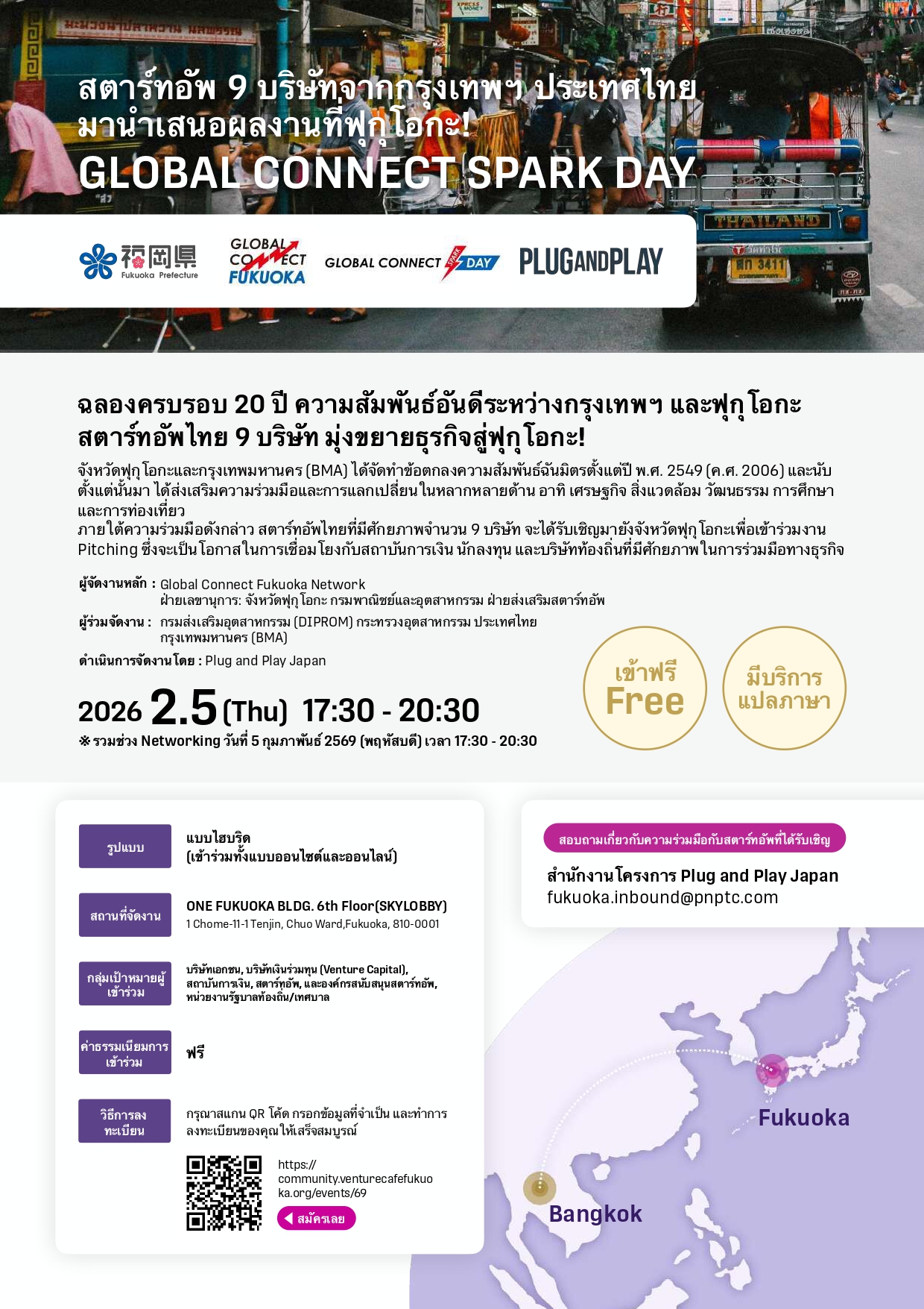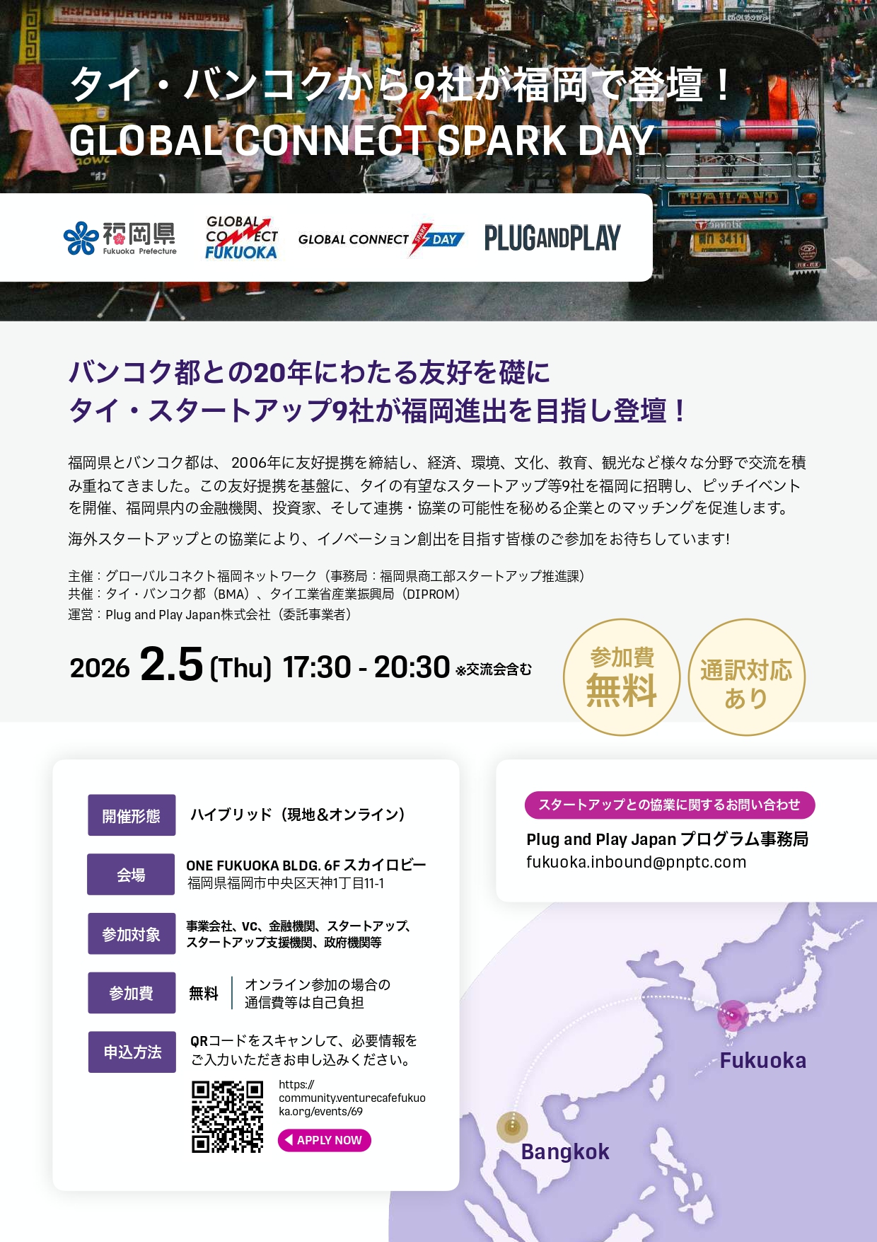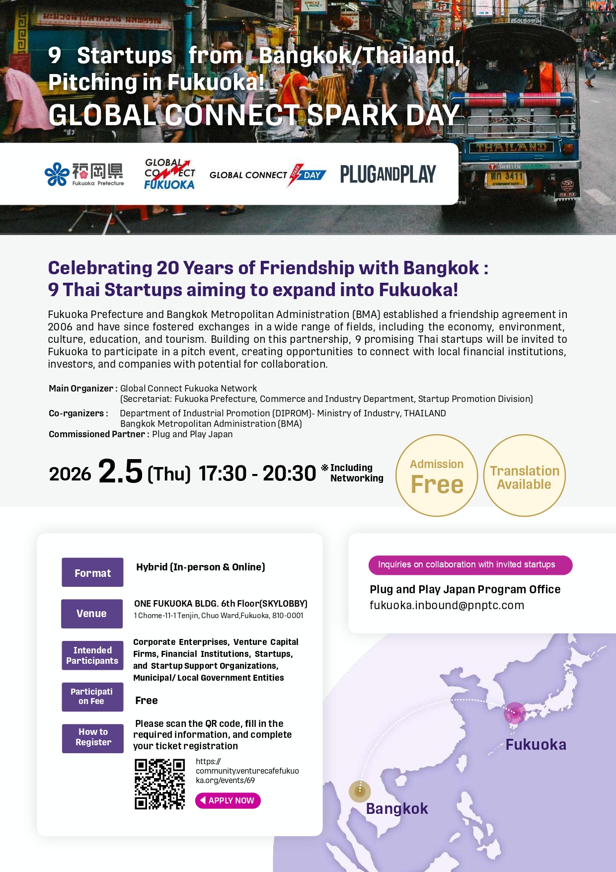 この友好提携を基盤に、タイの有望なスタートアップ等9社を福岡に招聘して、ピッチイベントを開催し、福岡県内の金融機関、投資家、そして連携・協業の可能性を秘める企業とのマッチングを促進します。