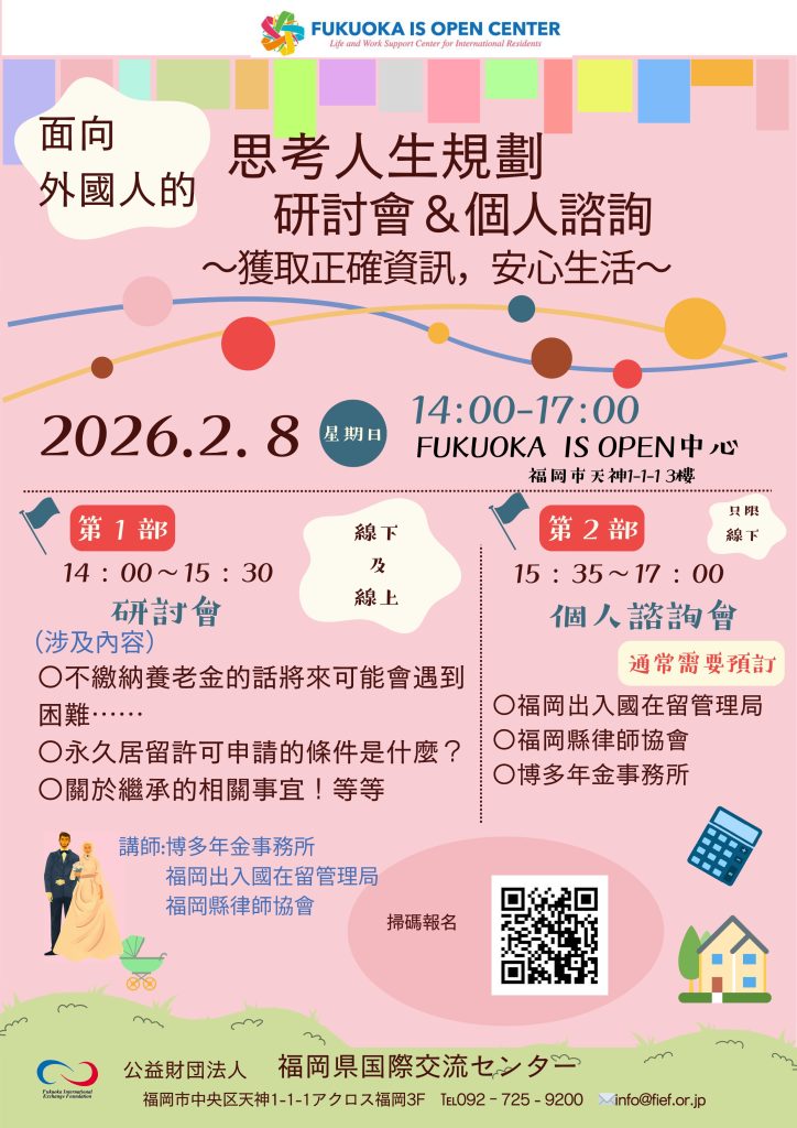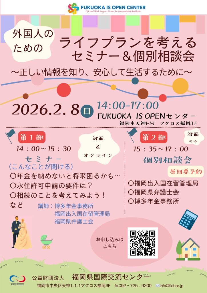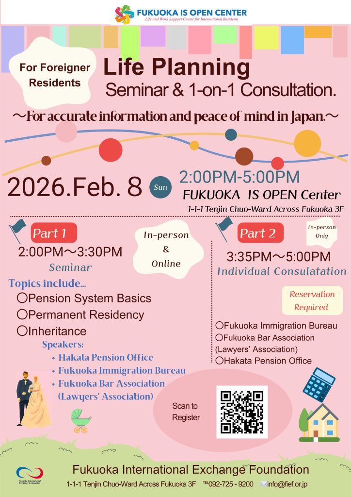 福岡にお住まいの外国人の方が自らのライフプランを考え、人生の各場面での手続きや、日本で安心して生活する上で果たすべき社会的義務があることを知っていただくためのセミナーと相談会を開催いたします。