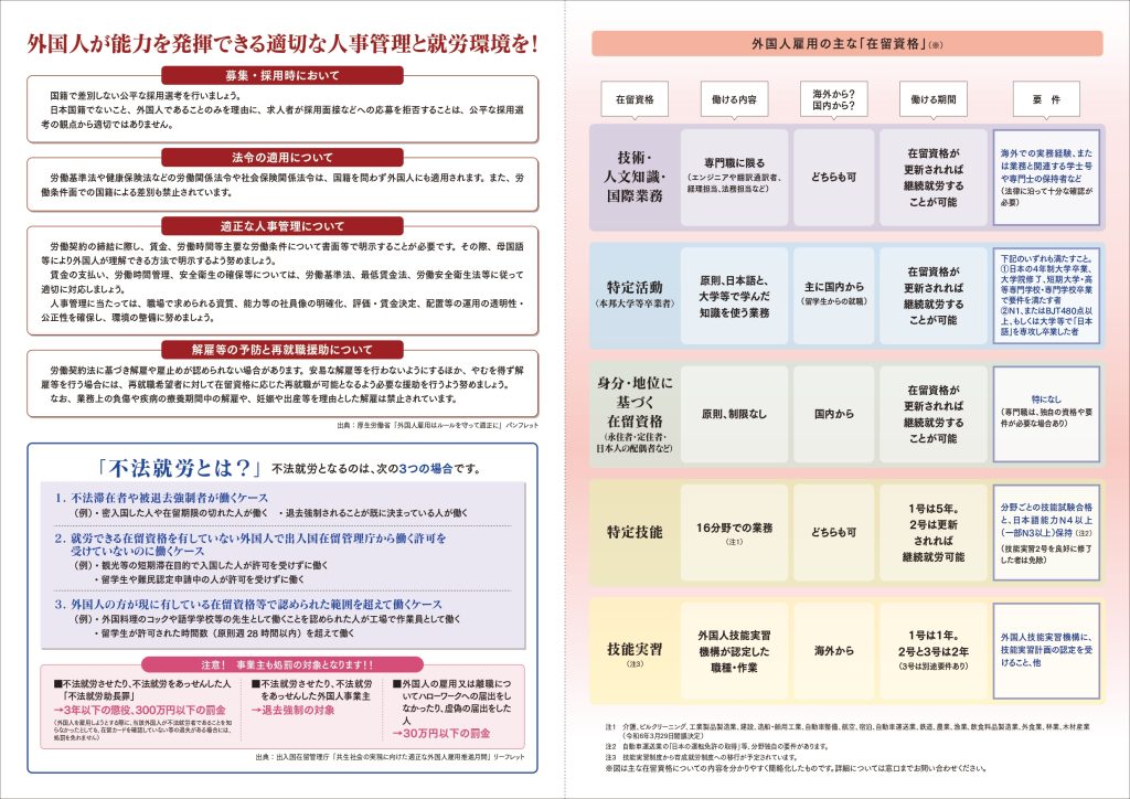 福岡県では、県内の企業等が外国人雇用に関する制度を正しく理解し、受け入れた外国人材が在留資格の範囲内でその能力を十分に発揮できる職場環境を整備できるよう、令和元年から「外国人材受入企業等支援事業」を実施し、支援・啓発等に取り組んでいるところです。