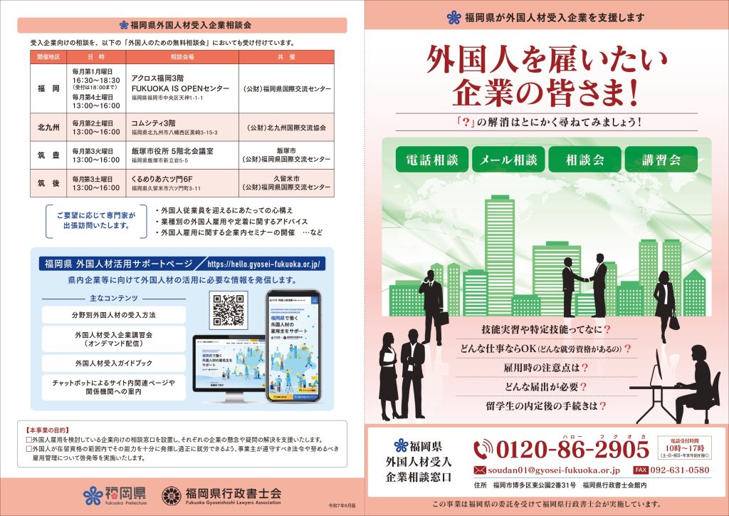 福岡県では、県内の企業等が外国人雇用に関する制度を正しく理解し、受け入れた外国人材が在留資格の範囲内でその能力を十分に発揮できる職場環境を整備できるよう、令和元年から「外国人材受入企業等支援事業」を実施し、支援・啓発等に取り組んでいるところです。